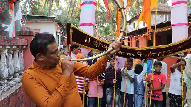 A local seen playing the 'Shing' at the beginning of Intruz procession.