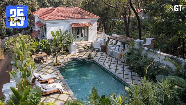 Nestled into the natural slope of Siolim, Villa Mandarina is a 4BHK Indo-Portuguese-inspired home that becomes especially magical during the rains. Its upper-level pool, carefully positioned to preserve two majestic trees, takes on a new life as the surrounding gardens transform with natural water features.