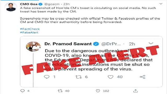 PANAJI: The Office of the Chief Minister (CMO) Goa on Wednesday clarified that it had not tweeted or sent messages asking education institutions in the State to remain closed amid coronavirus scare. Also, there are many other fake messages too which are being circulated via social media about coronavirus.