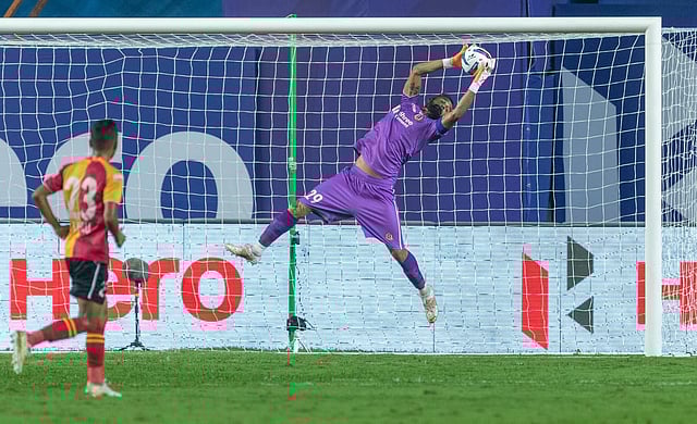 SC East Bengal goalkeeper Arindam Bhattacharya makes a crucial save against Mumbai City FC.