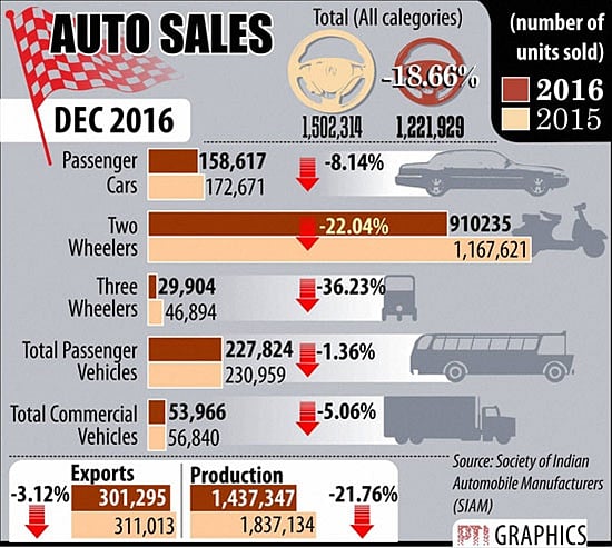 According to latest SIAM data, most of the major segments, including scooters, motorcycles and cars, witnessed record decline December sales as the automobile sector continued to bear the brunt of negative consumer sentiments in the wake of the ban of Rs 500 and Rs 1,000 banknotes announced in November. Vehicle sales across categories registered a decline of 18.66 per cent last month at 12,21,929 units, from 15,02,314 units in December 2015, as per Society of Indian Automobile Manufacturers (SIAM). "This is the highest decline across all categories since December 2000, when there was a drop of 21.81 per cent in sales. The reason is largely due to the negative consumer sentiment in the market due to demonetisation," SIAM Director General Vishnu Mathur told reporters here. Except for the light commercial vehicles segment, which saw a growth of 1.15 per cent at 31,178 units, all the other categories of the industry saw decline in sales in December, he added. Mathur, however, said the drop in sales is temporary but how sales pick up would depend a lot on "how the Bugdet comes up with steps that will boost consumer sentiments and increase disposable income besides improving the overall economy." Domestic car sales were at 1,58,617 units last month as against 1,72,671 units in December 2015, down 8.14 per cent. It was the lowest rate since April 2014 when sales declined by 10.15 per cent. Passenger vehicle sales declined 1.36 per cent to 2,27,824 units in December 2016 from 2,30,959 units in the year-ago month. The previous biggest decline in sales witnessed by the segment was in October 2014 with a drop of 7.52 per cent. Similarly, total two-wheeler sales in December also witnessed the steepest decline since SIAM started recording data in 1997. It tanked 22.04 per cent to 9,10,235 units compared with 11,67,621 units in the year-ago month. Likewise, scooter sales, which is mostly urban-centric, also saw the biggest decline in over 15 years, falling 26.38 per cent at 2,84,384 units in December 2016 as against 3,86,305 units in the year-ago month. The previous biggest decline of 27.05 per cent was recorded in March 2001. Motorcycle sales also saw the biggest decline in eight years last month at 5,61,690 units from 7,24,795 units a year earlier, down 22.5 per cent, SIAM said. The segment witnessed biggest drop of 23.07 per cent in December 2008. "Almost half of two-wheelers sales comes from rural markets, which have been hit hard by demonetisation," Mathur said while explaining why the segment has suffered a big blow in December. Sales of commercial vehicles were down 5.06 per cent at 53,966 units in December 2016 as against 56,840 units in the same month in 2015, SIAM said. Mathur said whatever sales December witnessed were "driven by the largest discounts ever that the industry has seen." He further said that moderation in sales in the auto industry is expected to continue this month as well as consumers defer purchases on Budget expectations. "At present, there is stock inventory of almost one month in the auto industry, which will have to be cleared," he added. When asked if SIAM would revise its growth forecast for the ongoing fiscal for passenger vehicles, considering the drop in sales in November and December, he said the industry body hasn't looked at the matter yet. "However, with the way things are going and if the Budget doesn't bring big steps to boost consumer sentiments, we may miss our forecast," Mathur said. Last September, SIAM had revised upward its growth estimate for passenger vehicles for the ongoing fiscal to 10-12 per cent. The segment was originally pegged to grow at 11-13 per cent but was later revised downward to 6-8 per cent. Mathur said that the auto industry hasn't yet benefited from a good monsoon and 7th Pay Commission payouts and a lot would depend on the Budget going forward. According to SIAM data, in the cars segment, market leader Maruti Suzuki India saw its domestic sales decline by 10.93 per cent in December at 81,092 units as against 91,043 units in the same month a year ago. Similarly, rival Hyundai Motor India also witnessed a decline of 10.95 per cent at 33,037 units last month as against 37,101 units in December 2015. Tata Motors, however, posted a jump of 39.59 per cent at 9,632 units as compared with 6,900 units in December 2015. In the motorcycles segment, market leader Hero MotoCorp saw its sales dip by 28.98 per cent to 2,79,448 units last month as against 3,93,495 units in December 2015. Homegrown rival Bajaj Auto also saw a decline of 11.35 per cent at 1,06,665 units as against 1,20,322 in the year-ago month. However, Royal Enfield posted a growth of 40.65 per cent at 56,316 units last month as compared with 40,037 units in December 2015, thus becoming the third biggest motorcycle seller in the month overtaking Honda Motorcycle and Scooter India (HMSI) which posted sales of 53,400 units as against 92,280 in the same month in 2015, down 42.13 per cent. In the scooters segment, market leader HMSI posted sales of 1,51,758 units last month as against 1,98,260 units in December 2015, down 23.45 per cent. Chennai-based TVS Motor Co saw its scooter sales dip by 16.17 per cent at 52,116 units as against 62,173 units in December 2015. Hero MotoCorp also saw its scooter sales dip by 60.27 per cent at 32,785 units as against 82,517 units in the same month a year ago.