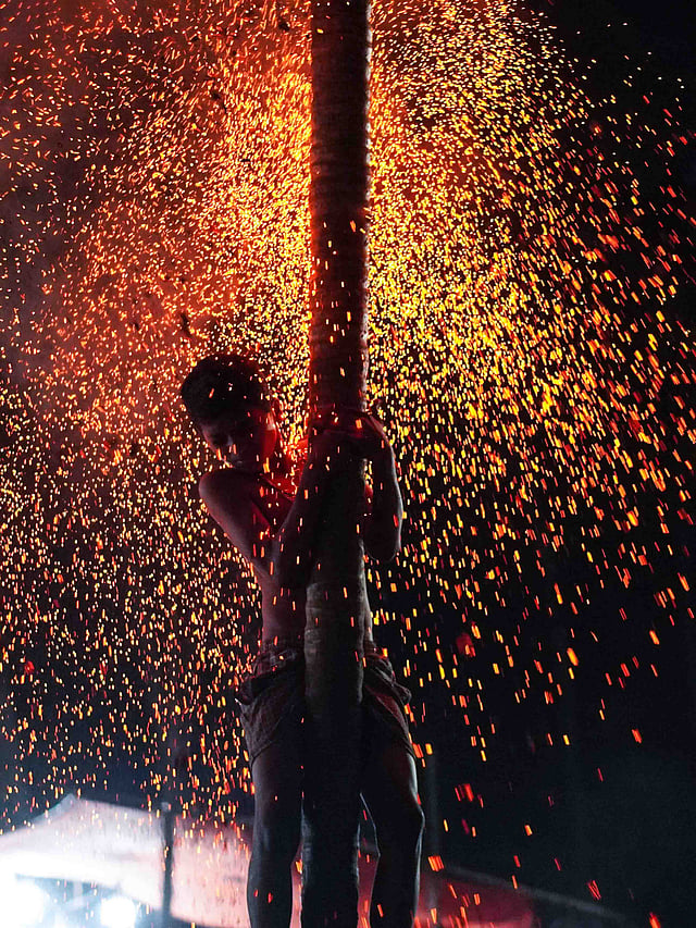Soon, men arrive at the temple carrying areca nut palms, which they subsequently position behind the shrine of Zalmi near the temple. Subsequently, individuals climb these palms, while others hurl fire at them.