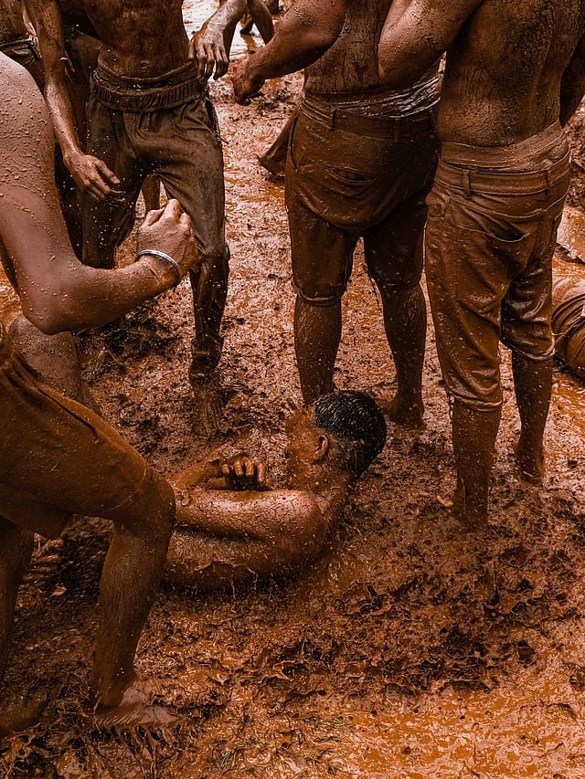 It is believed that applying mud on the body helps cure a variety of skin diseases. All the participants (men folk) slather oil on their bodies and then make their way out of the temple to play games.