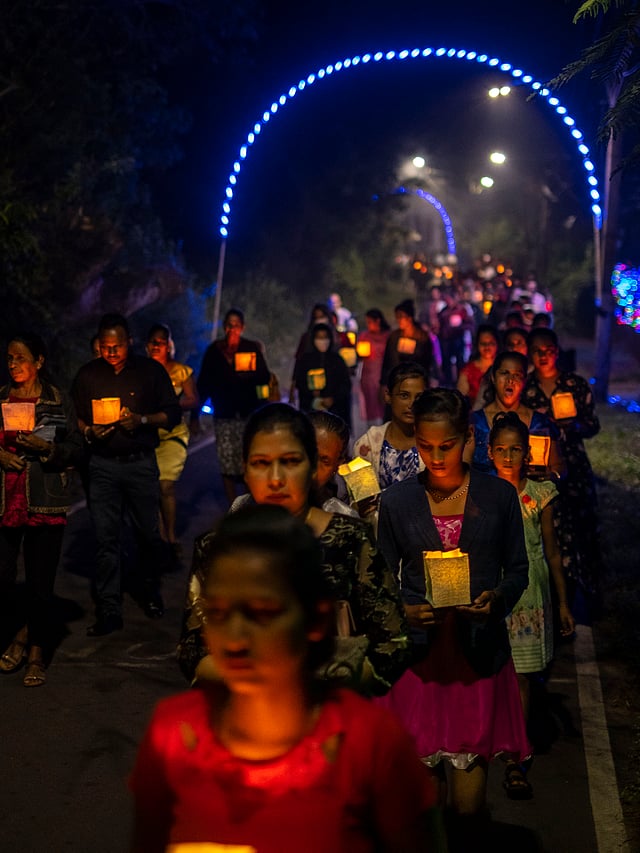 The route of the procession is beautifully lit and the people carry candles with pretty paper shades. As the procession passes through the village, more and more people joining in.