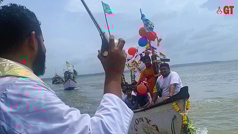 The procession then moves toward the boats anchored at the jetty. The priests enters the boat where a statue of St Peter is mounted on the beam and it moves out to the sea. It is followed by seven smaller decorated canoes and along the way there are prayers recited and the priest imparts his blessing on the sea.
