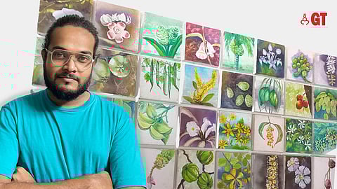 In Gadekar’s work, we come across a video that speaks about the bond between nature and local festivals of Goa. He emphasizes this with a beautiful watercolour collage of the flora, which is used on a matoli—a wooden canopy suspended above the Ganesh idol during the annual Ganesh Chaturthi festival.
