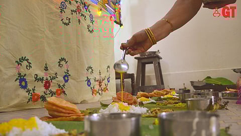 All these dishes are served on a banana leaf and is first offered to the deities, which is known as naivaidya. Five plates are served to the deities. In some families, a small plate is offered to the mouse—the vahan of Lord Ganesh.