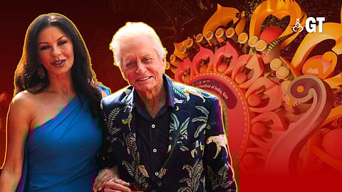 "Our family loves India and this is our fourth visit to the country," said Douglas, "and we are just looking forward to a great time here." He was addressing a time-constrained packed media conference at the 54th International Film Festival of India after walking the red carpet on Monday, November 27, 2023.