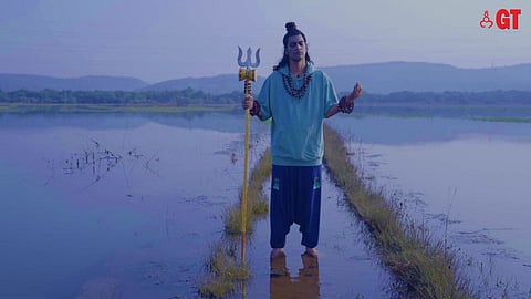The lively rhythm and enthusiastic vibe of Neelkanth Shankara commence with Mukesh Ghatwal, a talented artist from Goa, strolling through a waterlogged field portraying Lord Shiva. He adorns a half-man-bun hairstyle, an oversized hoodie, and harem pants, while holding a trishul and rapping the song's lyrics.