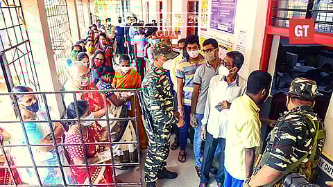 People stand in queues to cast their votes, during the Goa Assembly polls, at a polling station, in Goa, Monday, Feb. 14, 2022