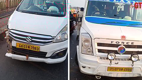 A source said that the impact of the collision was such that the front wheels of both the vehicles were locked, and they got stuck in the middle of the road blocking the traffic movement from both the sides of the old Zuari Bridge during peak hours.