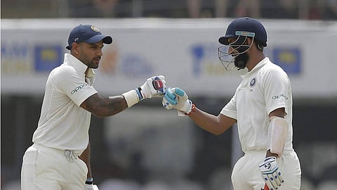GALLE : Shikhar Dhawan smashed a career-best 190 on his test return and Cheteshwar Pujara hit 144 not out to put India on course for a massive first innings total in the first test against Sri Lanka today.